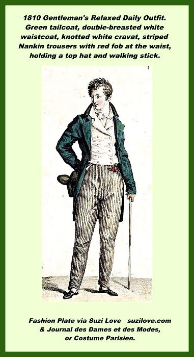 1810 Gentleman’s Relaxed Daily Outfit. Green tailcoat, double-breasted white waistcoat, knotted white cravat, striped Nankin trousers with straps under the foot and red fob at the waist, holding a top hat and a walking stick. Fashion Plate via Journal des Dames et des Modes, or Costume Parisien.