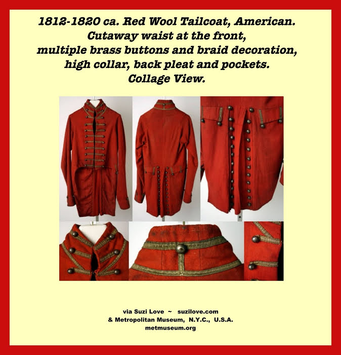 1812-1820 ca. Red Wool Tailcoat, American. Brass buttons everywhere, including on the tails and pockets. via Metropolitan Museum New York City, U.S.A. metmuseum.org