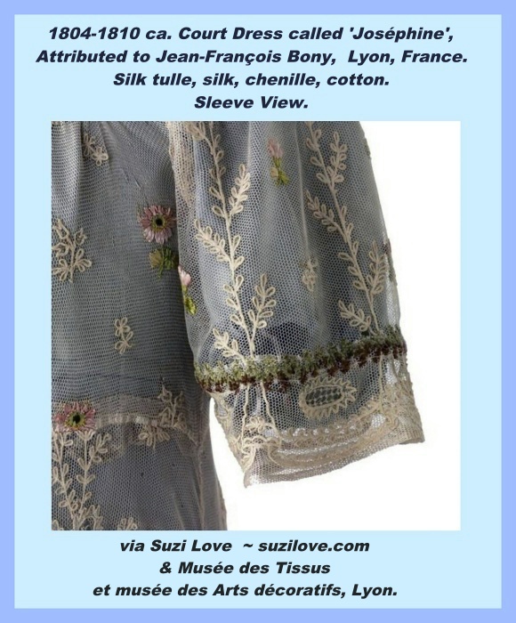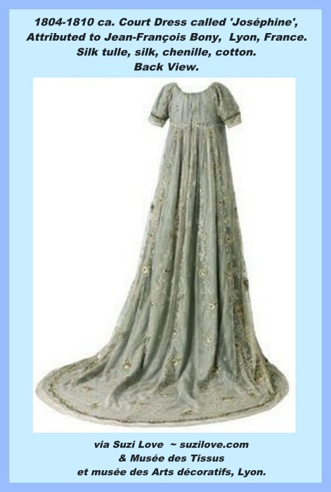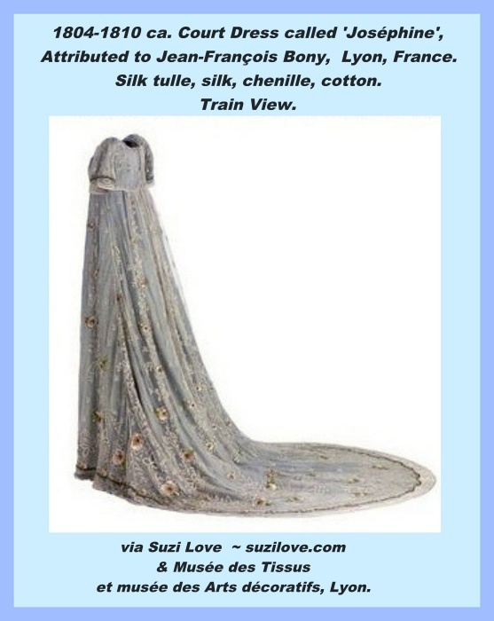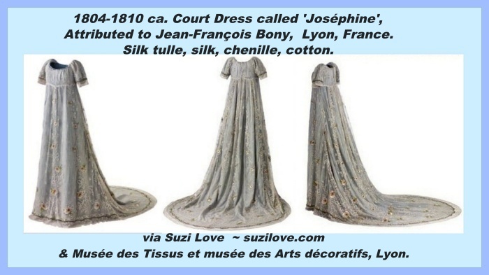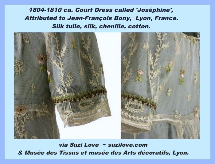 1804-1810 ca. Empire style, or high-waisted, French Court Dress called ‘Joséphine’, Attributed to embroiderer Jean-François Bony, Lyon, France. Silk tulle, silk, chenille, and cotton. via Musée des Tissus et musée des Arts décoratifs, Lyon. via Musée des Tissus et musée des Arts décoratifs, Lyon.