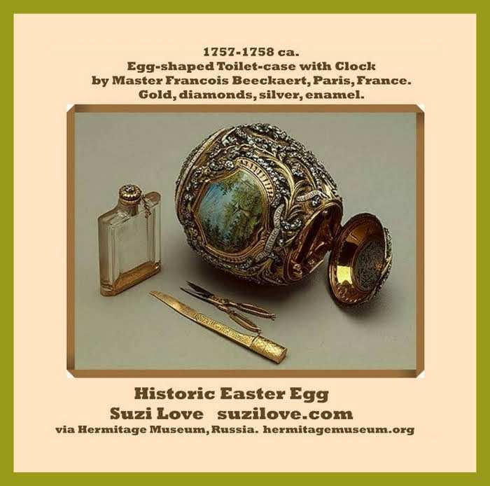 1757-1758 ca. Egg Shaped Toilet Case With Clock. By Master Francois Beeckaert, Paris, France. Gold, diamonds, silver, enamel. via Hermitage Museum, Russia.
