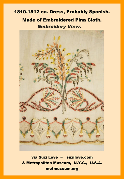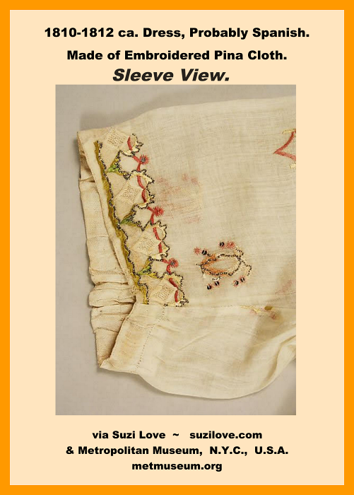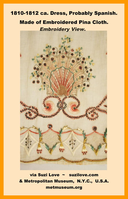 1810-1812 ca. Embroidery on Dress, Probably Spanish. Made of Embroidered cloth with Pina, or pineapple motifs. In Jane Austen’s times, pineapples were very much a luxury item. It became popular to sew items in pineapple shapes or to embroider pineapples onto articles. via Metropolitan Museum New York City, U.S.A. metmuseum.org