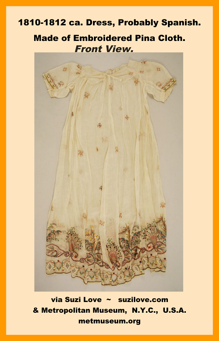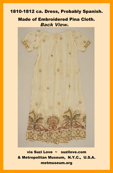 1810-1812 ca. Embroidered Dress With Pineapples, Probably Spanish, in Jane Austen style. #RegencyFashion #JaneAusten #Spain