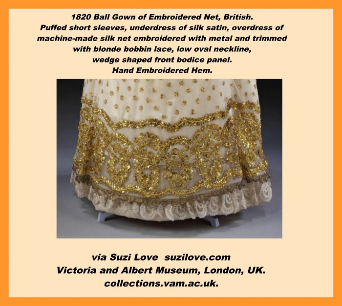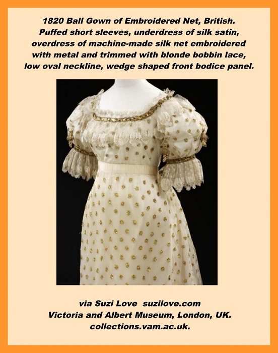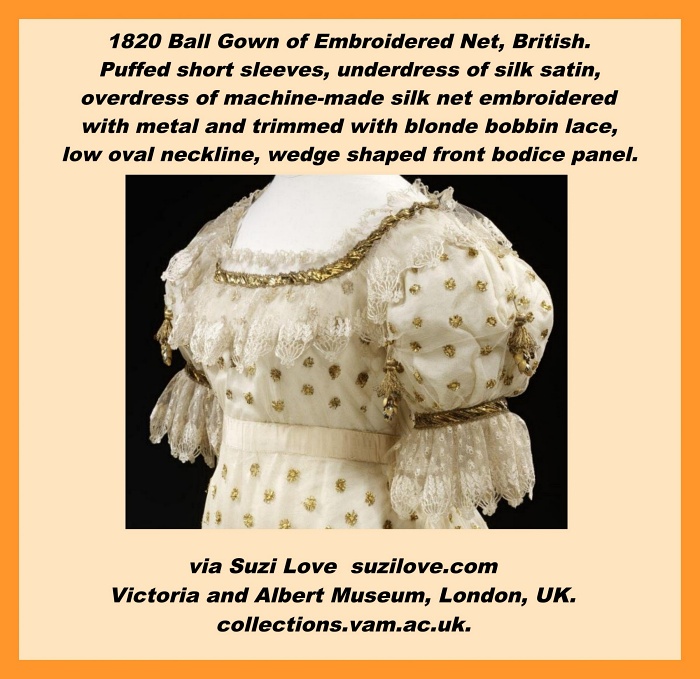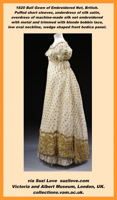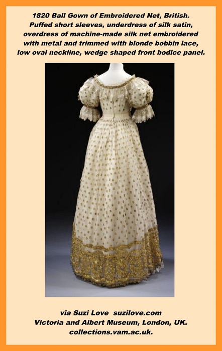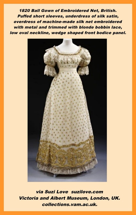 1820 Ball Gown of Embroidered Net, British. Silk satin and silk net embroidered with metal and trimmed with silk blonde bobbin lace, hand sewn. Short-sleeved ball gown comprising of an underdress of silk satin and an overdress of machine-made silk net embroidered with metal and trimmed with blonde bobbin lace. The dress has a low oval neckline, puffed short sleeves, a wedge shaped front bodice panel, and a medium high waist. The skirt has a central front panel, wedge shaped panels and the centre back panels are tightly gathered at the waist.