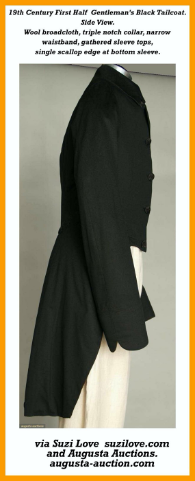Tailcoat: A Regency Era, or early 1800s, gentleman was outfitted in more practical fabrics, such as wool, cotton and buckskin rather than the fussy brocades and silks of the late 1700s. The men in Jane Austen’s life would have worn a black tailcoat like this for everyday wear. https://books2read.com/SuziLoveFashionMen1800-1819