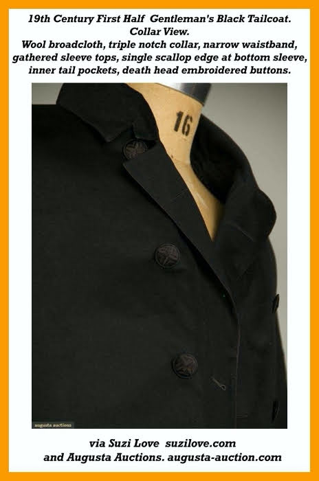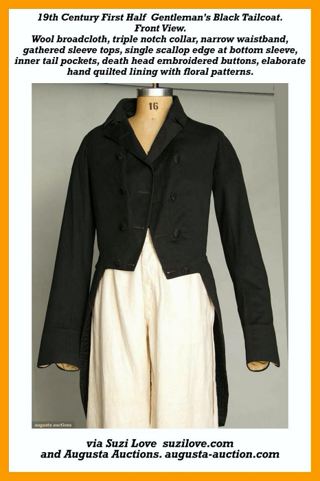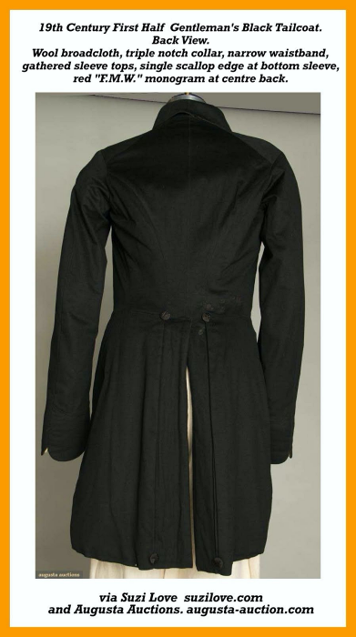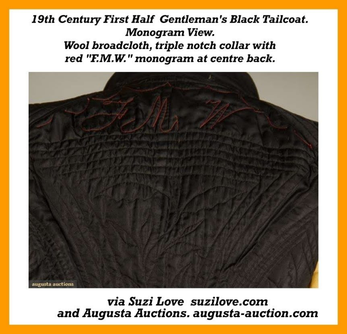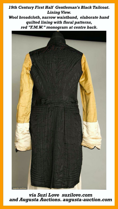19th Century First Half Gentleman’s Black Tailcoat. Wool broadcloth, triple notch collar, narrow waistband, sleeve tops gathered and uniformly wide to single scallop edge at bottom sleeve, inner tail pockets, death head embroidered buttons, elaborate hand quilted lining with floral patterns in concentric square frames and a “F.M.W.” monogram embroidered at the centre back top in red. Via Augusta Auctions – augusta-auction.com